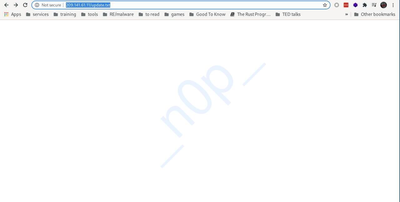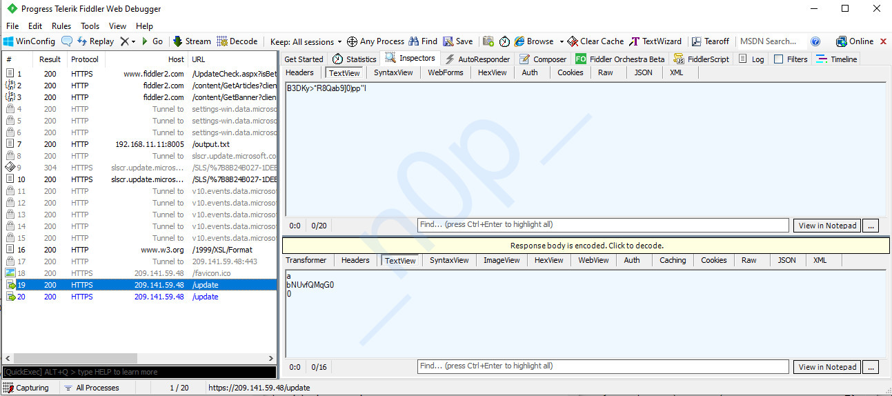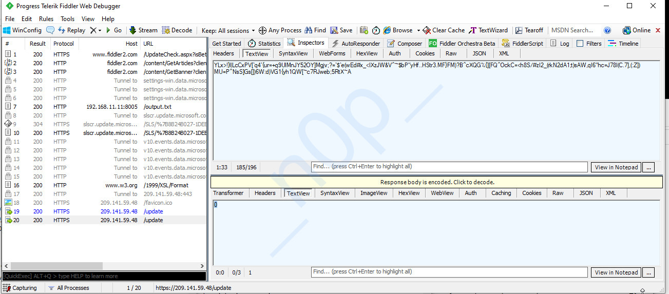 C2 IP address remains 209.141.59.48. The malware creates a TLS 1.2 connection to this IP and sends an encrypted text to the /update endpoint