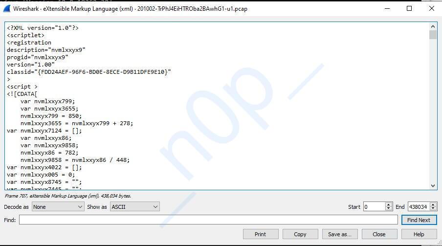Fortunately, update.txt is downloaded via HTTP so the PCAP file containing update.txt (Artifact #7 PCAP, 6b2da53f8bcae0cd99bdae18993bf8d485ac56be33d01af8f18022b9888eebd3, VT N/A) has a lot of information about the request and response: